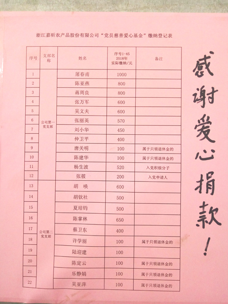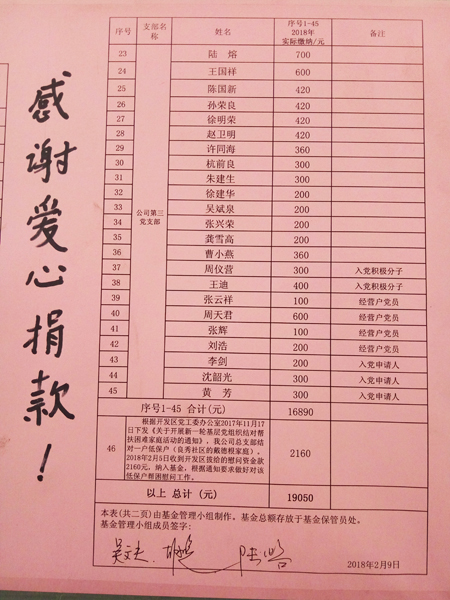 為繼續(xù)做好新一年度愛(ài)心基金工作,公司黨總支從2月5日-12日期間開(kāi)展了2018年度公司“黨員慈善愛(ài)心基金”捐贈(zèng)工作,得到了全體黨員、入黨積極分子、黨員經(jīng)營(yíng)戶和入黨申請(qǐng)人的熱烈響應(yīng),黨總支屠書(shū)記率先獻(xiàn)愛(ài)心,共有45位同志踴躍捐款共計(jì)16890元,連同開(kāi)發(fā)區(qū)下拔的結(jié)對(duì)困難戶慰問(wèn)資金2160元,總計(jì)19050元匯入公司“黨員慈善愛(ài)心基金”池,開(kāi)展2018年度向困難戶等扶弱濟(jì)困慰問(wèn)工作。